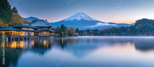 Obraz premium Japanese House and Mountain Reflection on a Still Lake at Dusk