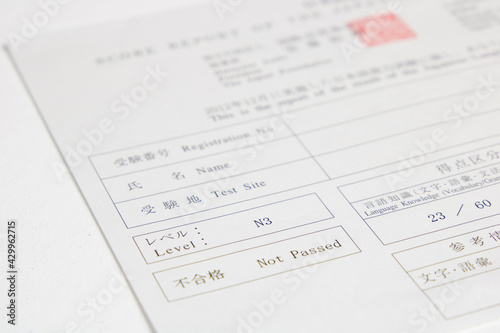 Obraz premium Japanese language proficiency test - JLPT. Nihongo nōryoku shiken. Final test result paper