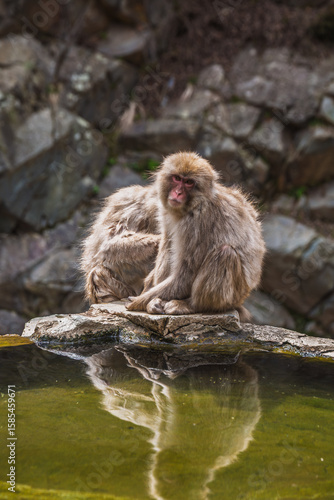 Naklejka premium Japanese macaque, also known as snow monkey, sits on a rock near a pond in Jigokudani Monkey Park, Nagano, Japan. The monkey's reflection is visible in the water.