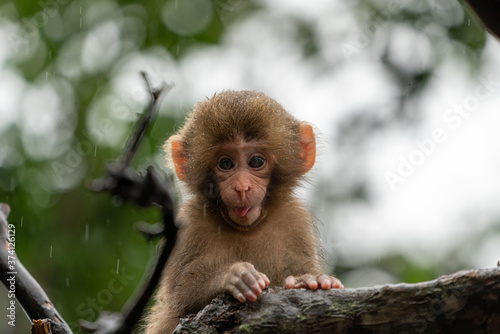 © exs, Fototapeta premium Japanese macaque in Arashiyama, Kyoto. A baby monkey is climbing a tree on a rainy day.