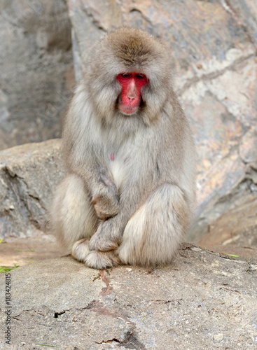 Naklejka premium Japanese macaque, known as snow monkeys live in colder climates in Japan and often visit warm water spa or onsen in the mountains near Nagano