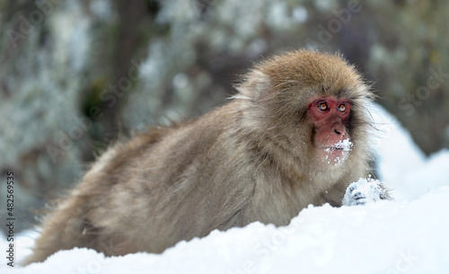 © Uryadnikov Sergey, Naklejka premium Japanese macaque on the snow. Snow monkey. The Japanese macaque ( Scientific name: Macaca fuscata), also known as the snow monkey. Winter season. Natural habitat.