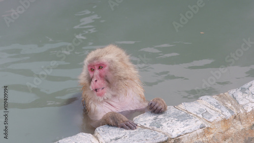Fototapeta premium Japanese Macaque Onsen Snow Monkey in Hot Spring Eating.