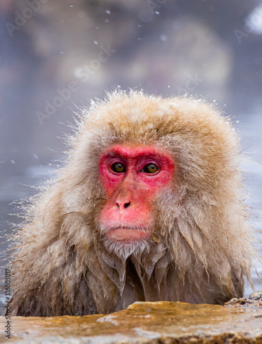 Naklejka premium Japanese macaque or snow Japanese monkey with onsen at snow monkey park or...