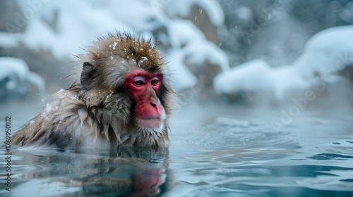 Naklejka premium Japanese Macaque Snow Monkey Warming In A Thermal Hot Spring Amid Snowy Steam