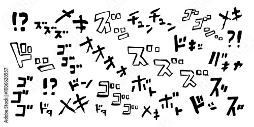 © Konstantin, Naklejka premium Japanese manga text words with anime emphasis font katakana motion letters set. Sounds manga words with handwritten calligraphy ink style collection vector illustration isolated on white background.