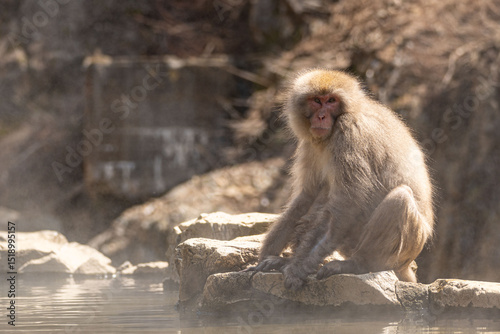 Naklejka premium Japanese maqaque or snow monkey with pinkish face and brown or greyish hair outdoor at daytime in the Jigokudani Monkey Park in Yamanouchi Nagano Prefecture in the wilderness of Japan.