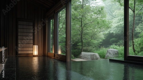 Obraz premium Japanese Onsen Interior Rain Forest View