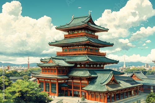 Fototapeta premium Japanese Pagoda, Cityscape, Sunny Day, Travel Poster