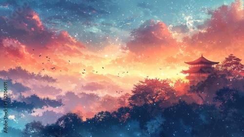 Fototapeta premium Japanese Pagoda Silhouette in Sunset Sky with Stars and Trees