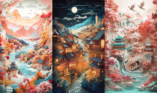 © Luke, Fototapeta premium Japanese Paper Landscape Art Depicting Japanese Temple and Gardens (Bundle of 3 vertical)