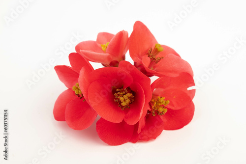 © Olga, Naklejka premium Japanese Quince (Chaenomeles japonica) in bloom on white background.