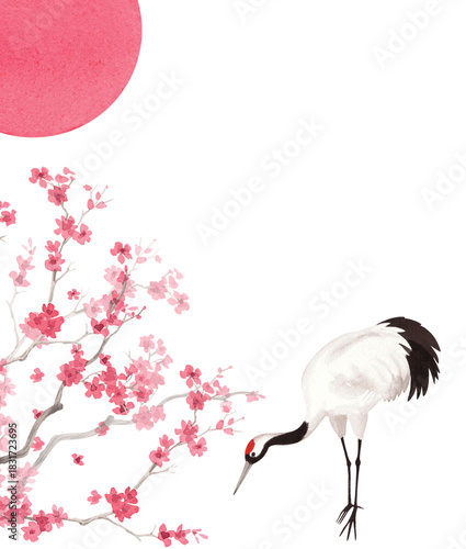 Fototapeta premium Japanese red crown crane flying above sakura and sun on the background. Watercolor handmade illustration. For fabric, wallpaper, greeting cards, design, decoration and illustration.