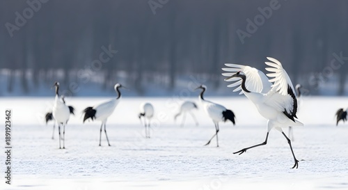 © ArtSync Studio, Fototapeta premium Japanese Red-crowned Cranes Dancing in the Snow Covered Field on a Sunny Day