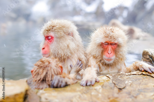 Naklejka premium Japanese snow monkey bathing in hot spring