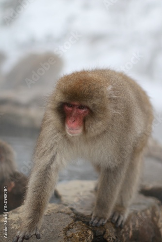 Fototapeta premium Japanese Snow Monkey Walking Along the Rocks Besides a Hot Spring in Winter,...
