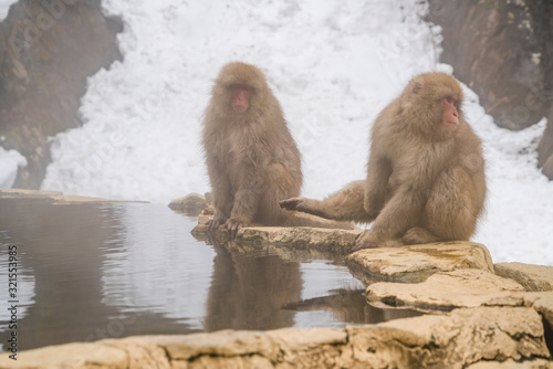Naklejka premium Japanese Snow Monkeys stay around the hot spring among snowy mountain in...