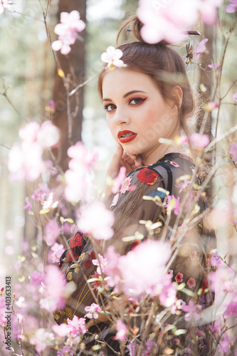 Fototapeta premium Japanese-style girl in a flowering forest among pink flowers in spring