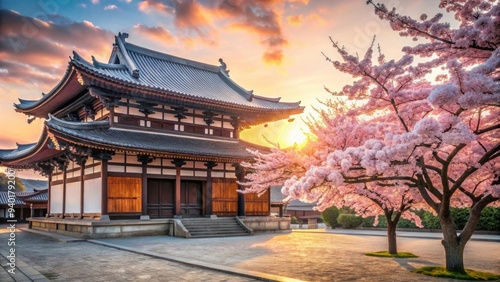 Fototapeta premium Japanese temple in the morning with a blooming cherry blossom tree , Japan, temple, morning, cherry blossom, tree, pink