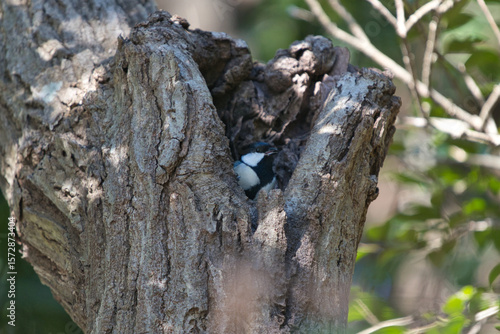 © moto, Obraz premium Japanese Tit Peeking from Tree Cavity