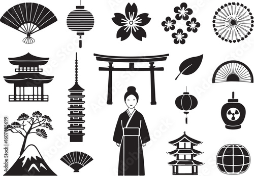 Naklejka premium Japanese Traditional Icons in Silhouette on White Background Premium Vector Set