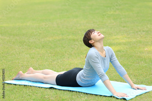 Fototapeta premium Japanese woman doing yoga Cobra Pose