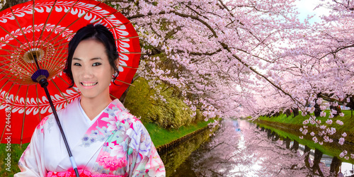 Fototapeta premium Japanese woman in Kimono dress with Full bloom Sakura - Cherry Blossom at...