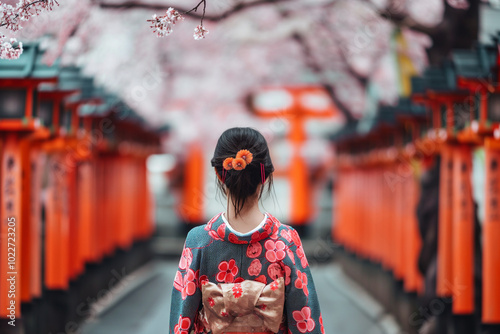 © Dima, Fototapeta premium Japanese Woman in Traditional Kimono Admiring Cherry Blossoms. View from behind. Generative AI