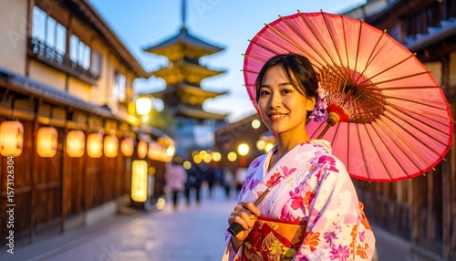 © CreativeArs, Fototapeta premium Japanese woman wearing traditional kimono and holding a fan in classic cultural attire.
