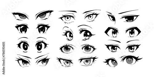 © Dedraw Studio, Fototapeta premium Japenese anime eye close up set on isolated background. Black and white manga cartoon character, animation art style bundle. Trendy Y2K eyes, facial expression graphic, diverse comic book people.