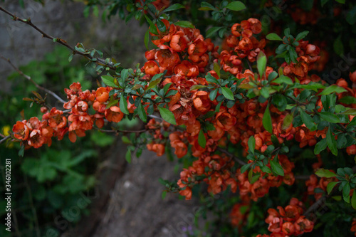 © Kiryl Krasiou, Obraz premium japonica bush Red flowers quince