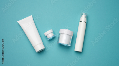 © nndanko, Fototapeta premium jar, bottle and empty white plastic tubes for cosmetics on a blue background. Packaging for cream, gel, serum, advertising and product promotion
