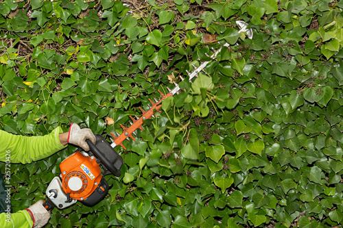 © Lola Fdez. Nogales, Naklejka premium Jardinero podando la hiedra con herramienta de recorte.