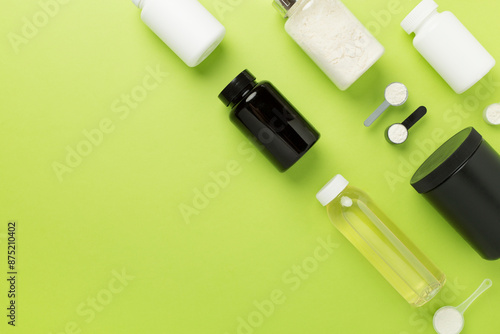 © Liami, Fototapeta premium Jars with protein powder on color background, top view. Sports nutrition concept