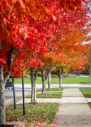 Naklejka premium jaskrawoczerwone i pomarańczowe jesienne drzewa z chodnikiem