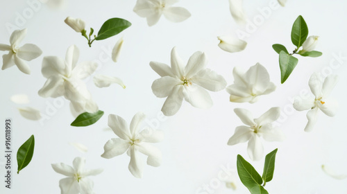 © Rabil, Fototapeta premium Jasmine blossoms, with their delicate petals, are suspended in the air against a plain white backdrop.