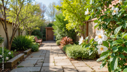 Fototapeta premium Jasmine flowers blooming in sunny patio garden, vibrant tranquility