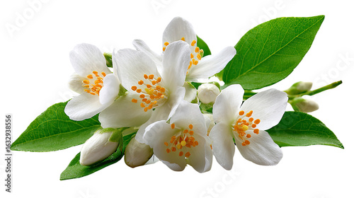 © Meesunal, Obraz premium Jasmine Flowers' Freshness: An exquisite arrangement of delicate, pristine white jasmine blooms, complemented by vibrant green leaves, embodies the very essence of purity and elegance.