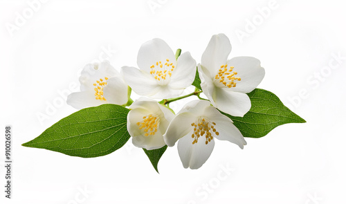 © karacacennet, Obraz premium Jasmine flowers with green leaves isolated on a white background. isolated