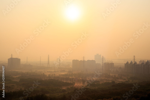 © Osaze, Fototapeta premium Jasne słońce wschodzące nad liniami energetycznymi i poranna mgła na przedmieściach Szanghaju