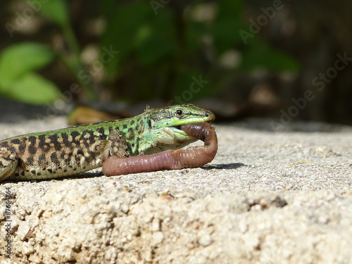 © WORLD OF INSPIRATION, Naklejka premium Jaszczurka zwinka zjada dżdżownice, lacerta agilis, Lumbricidae