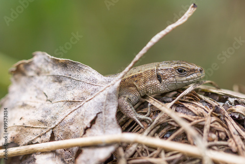 Fototapeta premium Jaszczurka żyworodna i suchy liść