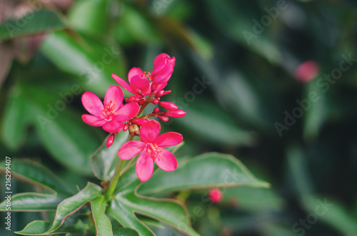Obraz premium Jatropha integerrima flowers small red selective focus on green background.