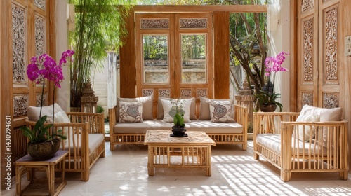 Fototapeta premium Javanese courtyard with bamboo sofa set, blooming orchids, carved wooden...