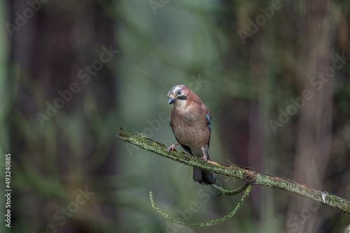 Fototapeta premium Jay perched on a branch of a tree, with a blurred background in a forest...