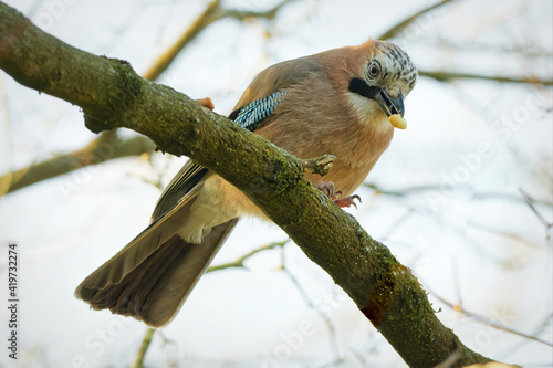 Obraz premium jay perches on a branch and eats an acorn