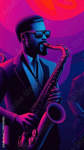 Fototapeta premium Jazz band on stage, vibrant performance with saxophone, vector art