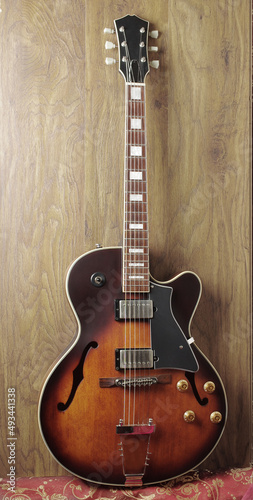© yrafoto, Fototapeta premium Jazz electro guitar on wooden texture background.