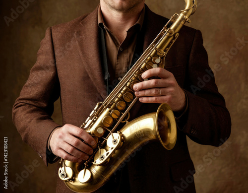 Fototapeta premium Jazz Musician Holding Saxophone – Studio Portrait in Warm Lighting