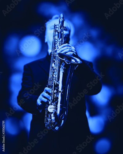 © 4th Life Photography, Fototapeta premium Jazz Musician Playing Tenor Saxophone (classic blue tone)